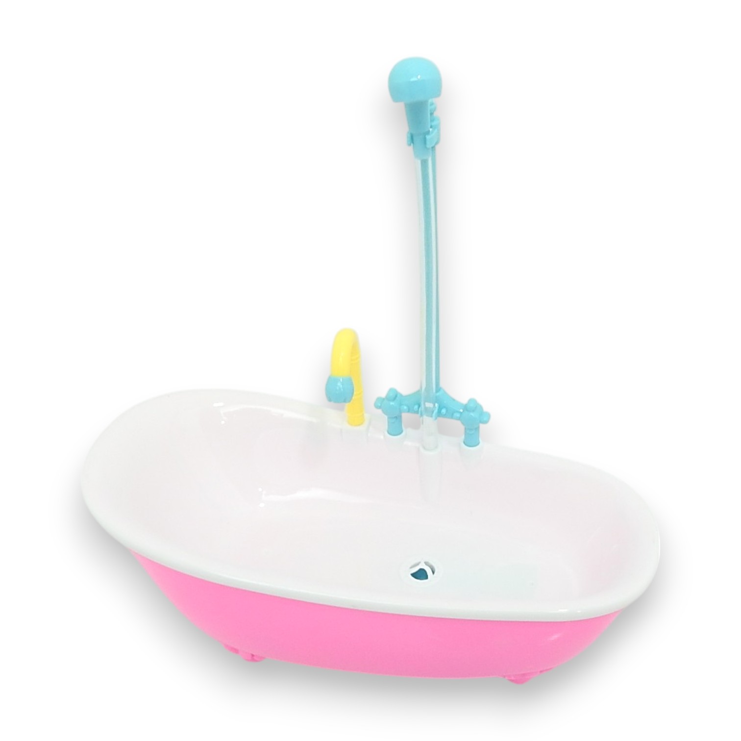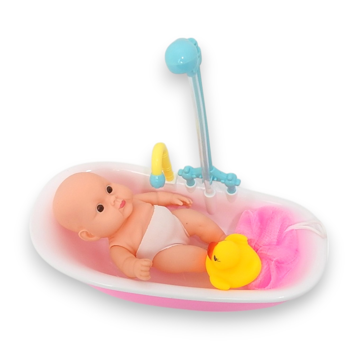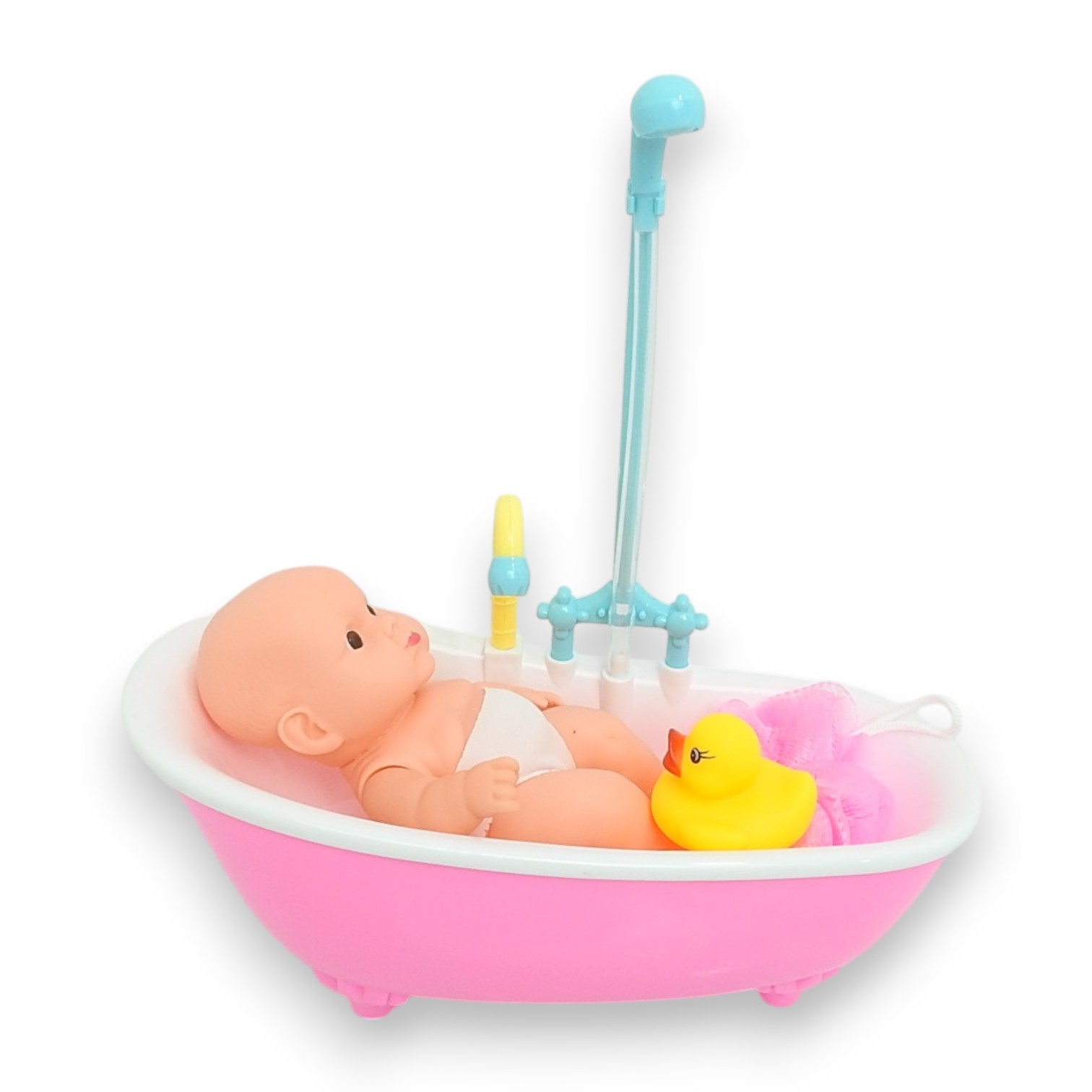 ¡Bañá a Luly con agua de verdad y diversión asegurada! Al girar la perilla se activa la ducha, la luz y la música. Incluye muñeca de 18 cm, bañera de 27,5 x 18,5 x 7,5 cm, esponja, toallita, patito y mamadera. Requiere 4 pilas AA (no incluidas).