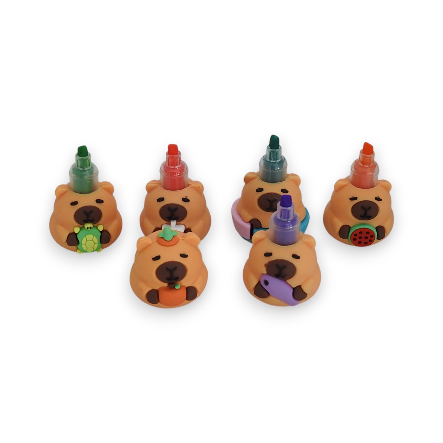 Dale un toque divertido a tus dibujos y notas con este set de marcadores de Capybara. Cada fibrón viene con un diseño adorable de la cabecita del animalito. Son cómodos de usar, fáciles de guardar y súper atractivos para los fans del roedor. Incluye 6 colores surtidos