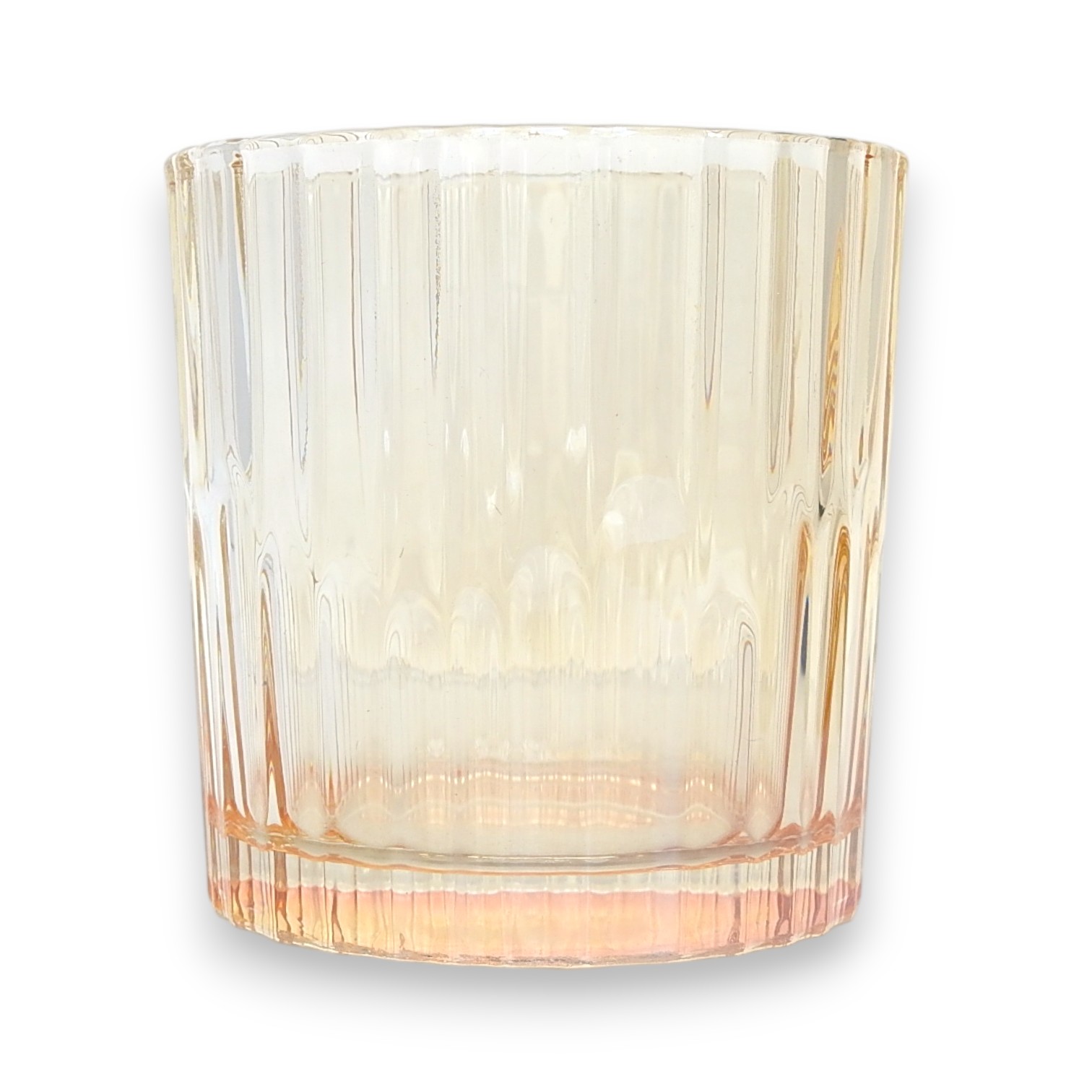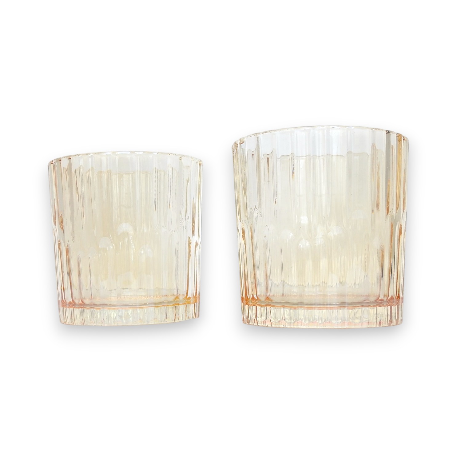 Set x 6 unidades de vasos cortos de vidrio transparente color dorado, con detalles de líneas con relieve. Debido a la alta demanda, el producto no tiene devolución.