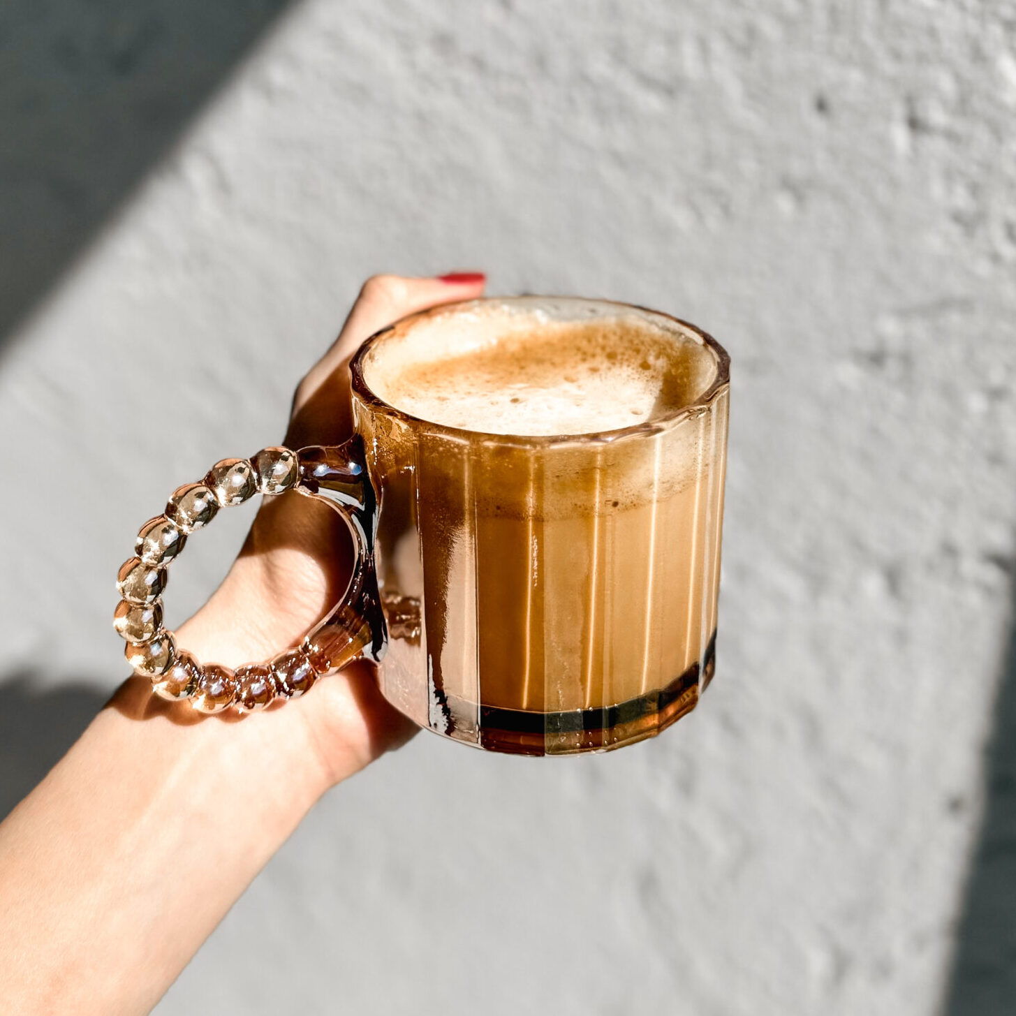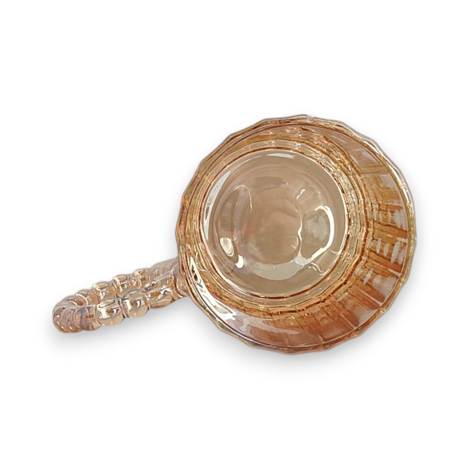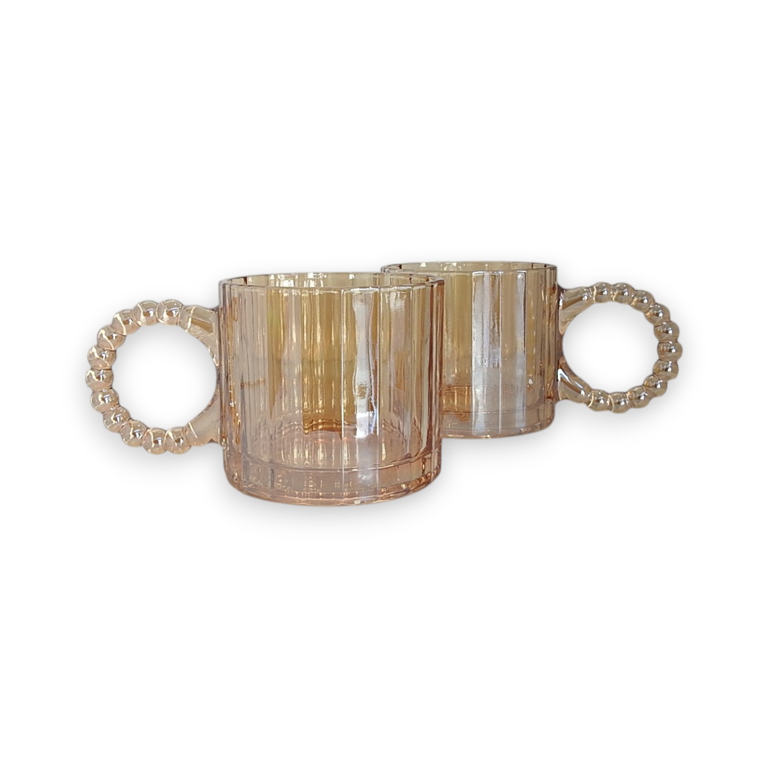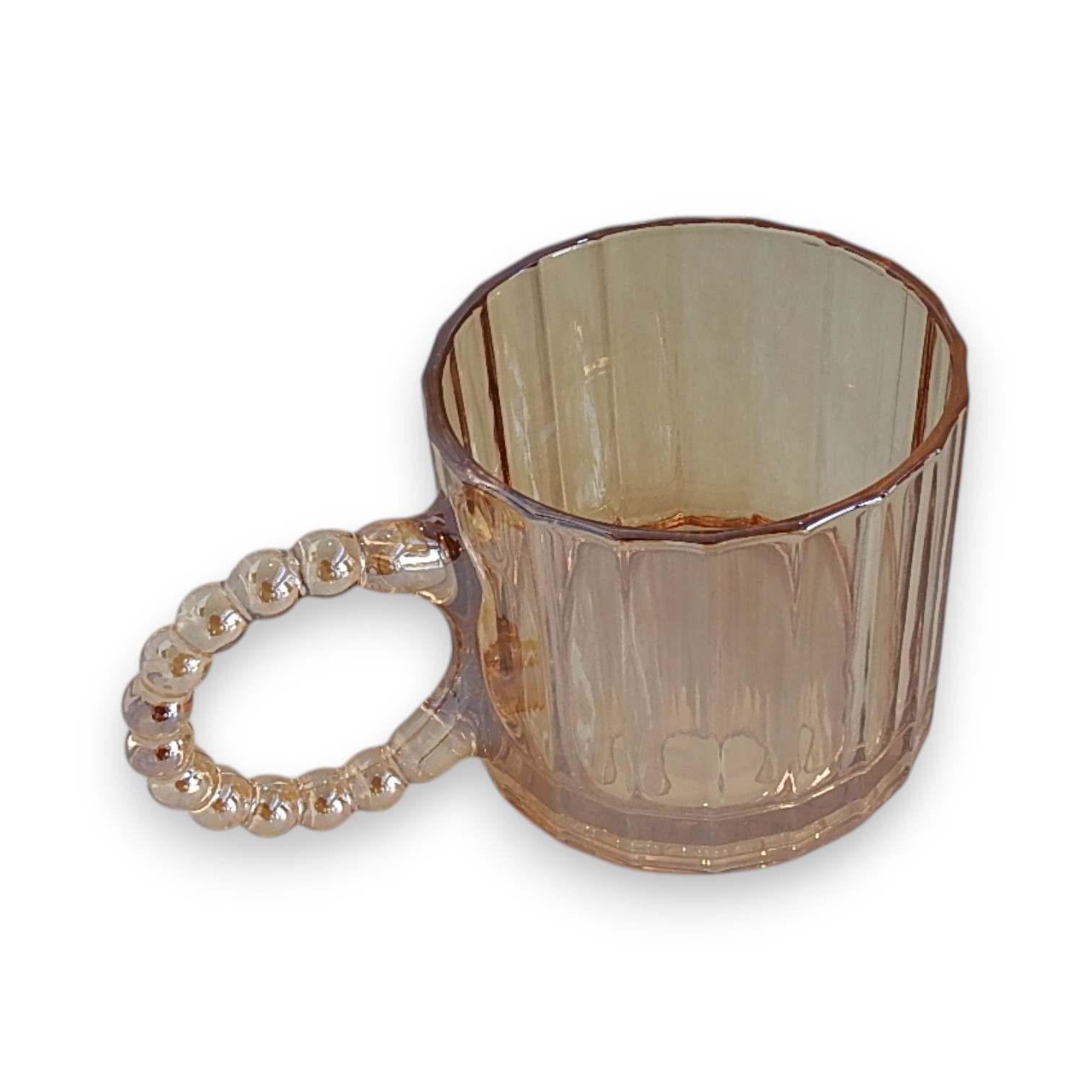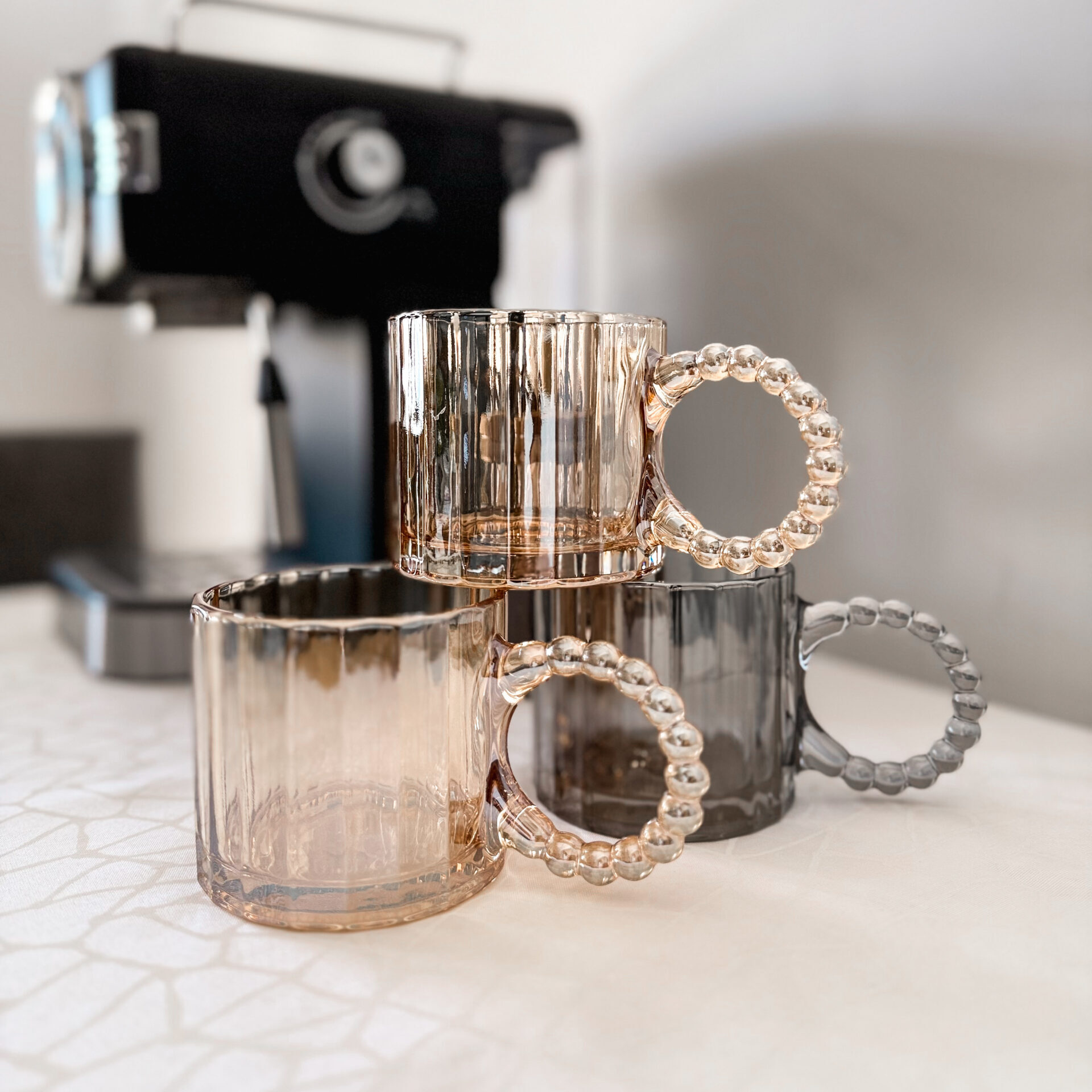 Elegante y moderna, esta taza de vidrio transparente es perfecta para disfrutar café, té o tu bebida favorita. Su diseño cilíndrico con relieve le aporta un toque sofisticado, mientras que el asa circular con detalles en esferas suma estilo y originalidad. Capacidad: 320 ml. Venta por unidad.
